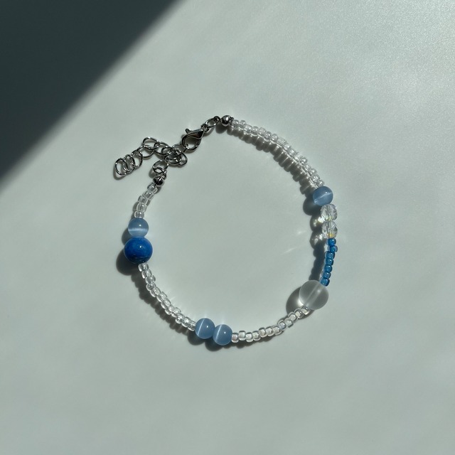 blue stone bracelet / ブルーストーンブレスレット 夏らしいブルーと涼しげなクリアのビーズを組み合わせたブレスレット 大小様々なビーズを使用し、シンプルながらも存在感があり 夏のコーデにぴったりのアイテムです♪ 素材:真鍮 (金具) サイズ:約18~22.5cm
