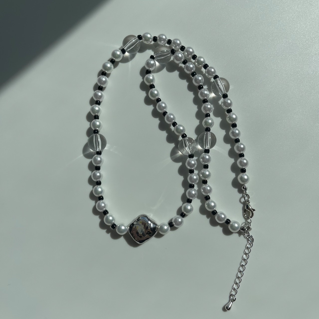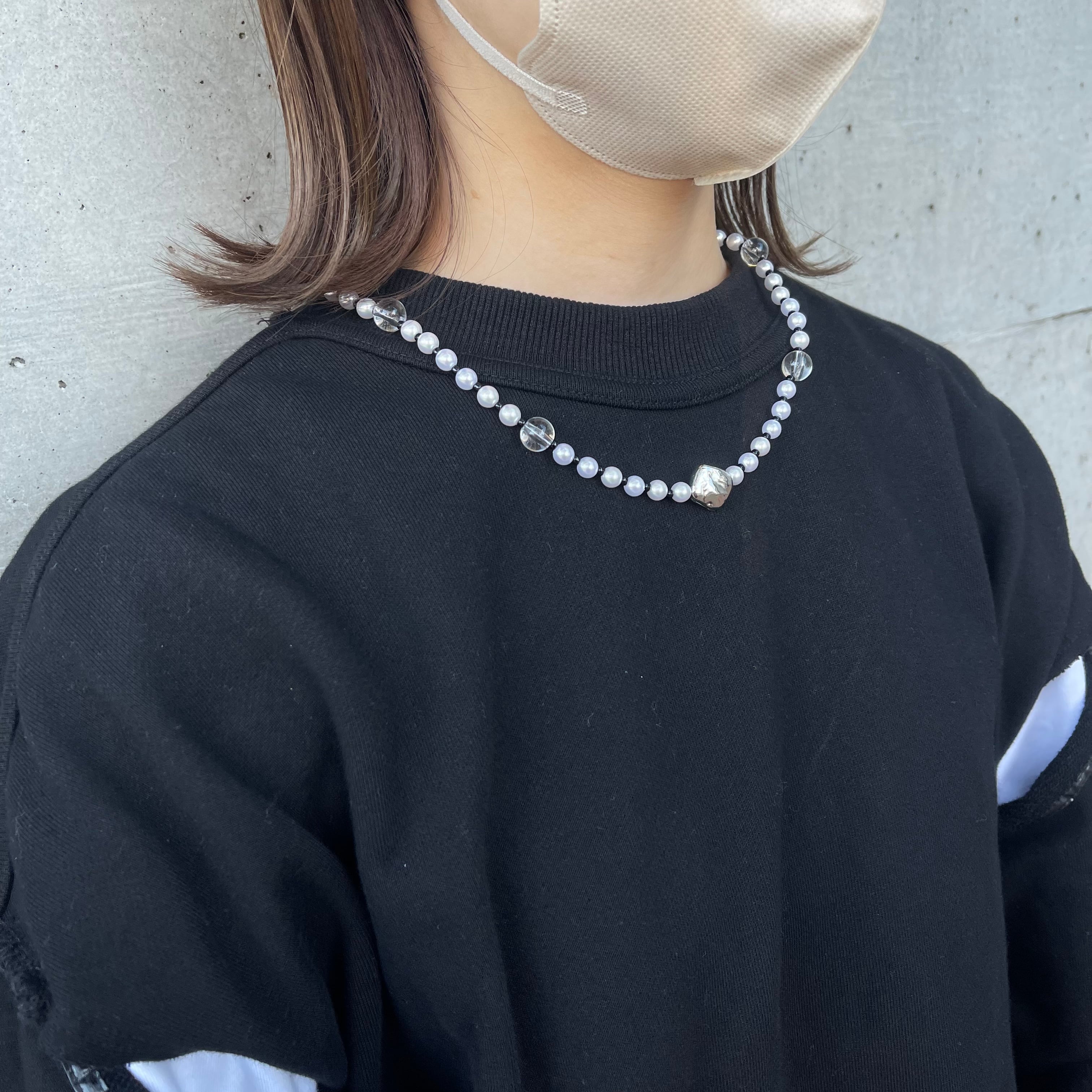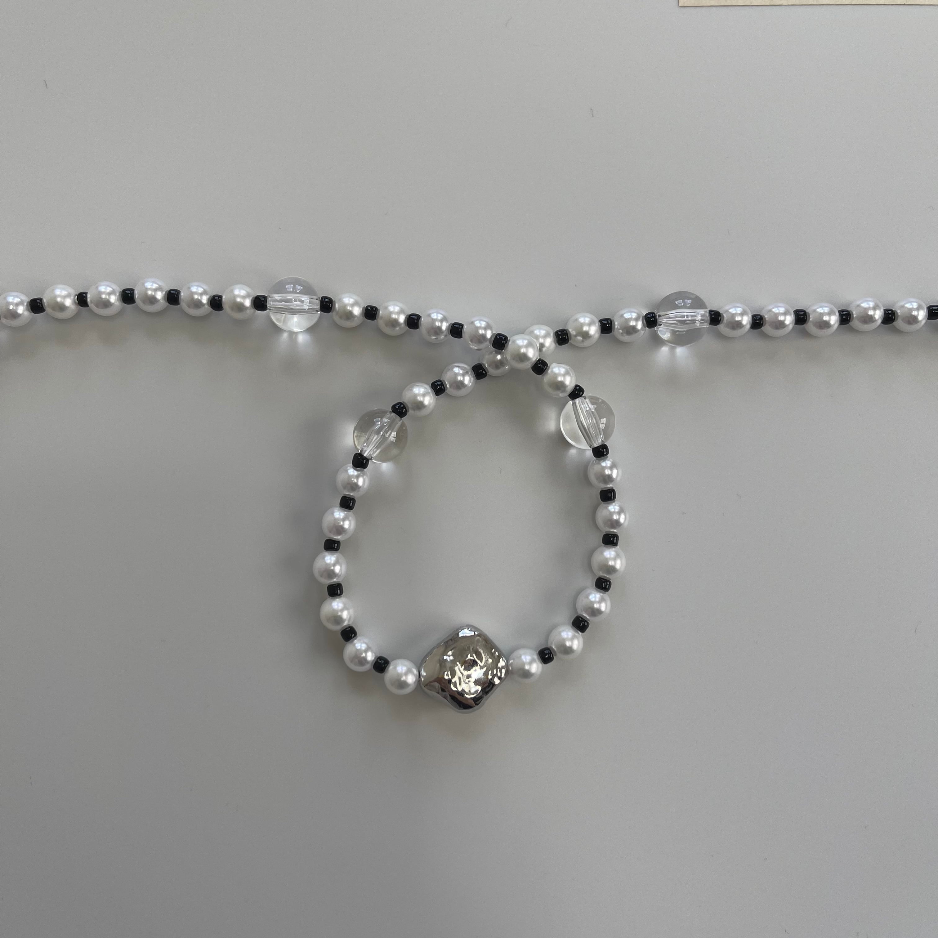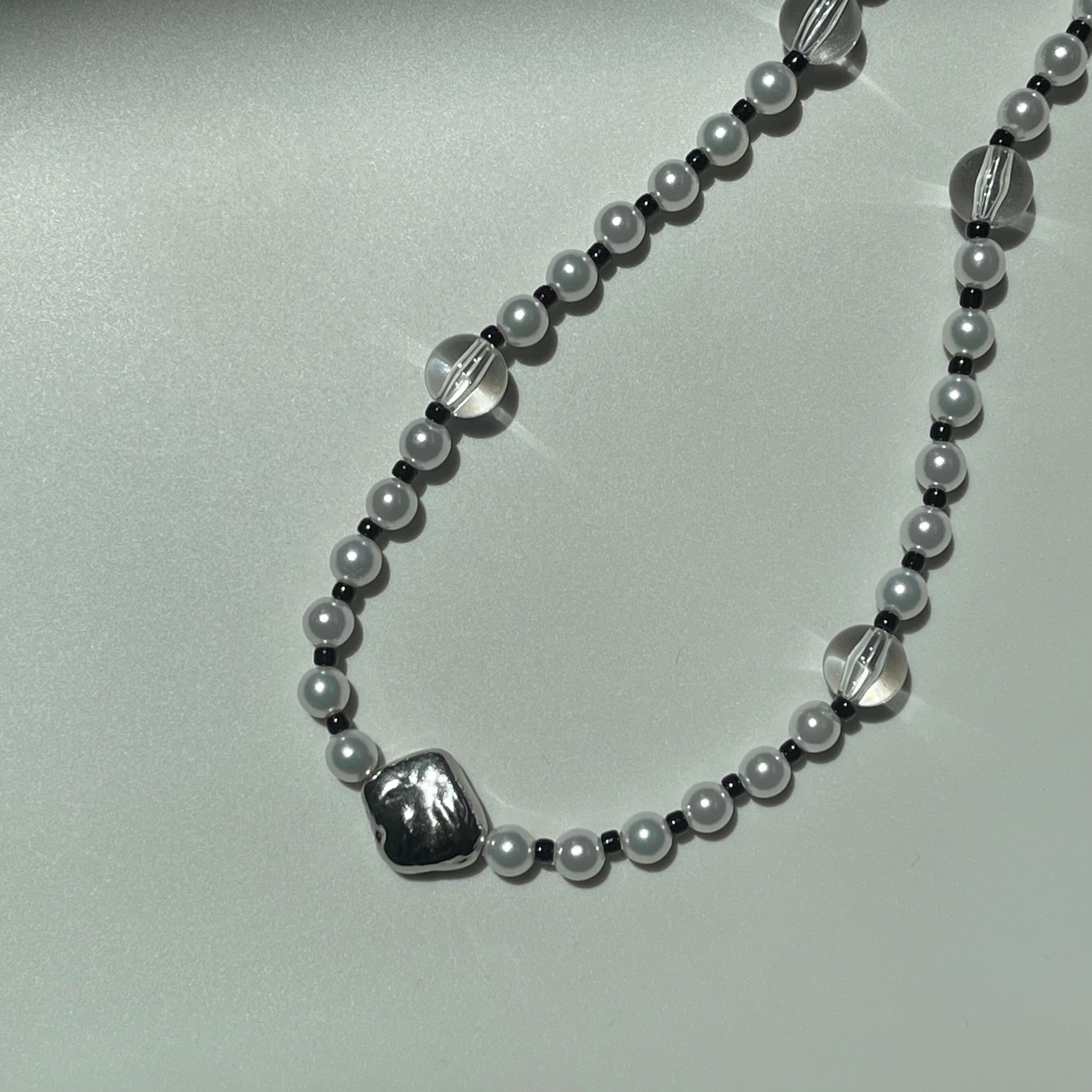 パールにシルバーのモチーフやクリア・ブラックのビーズを合わせ、