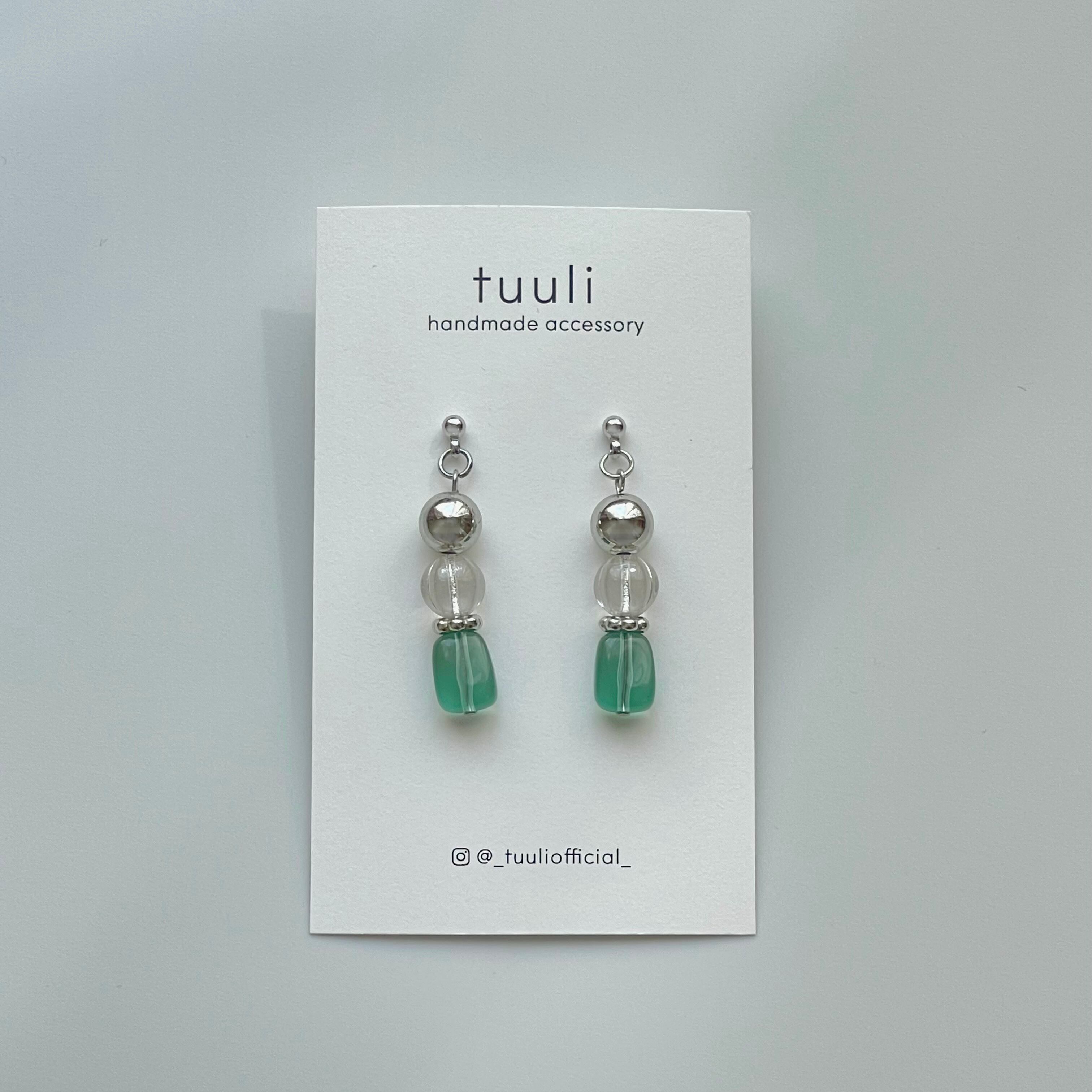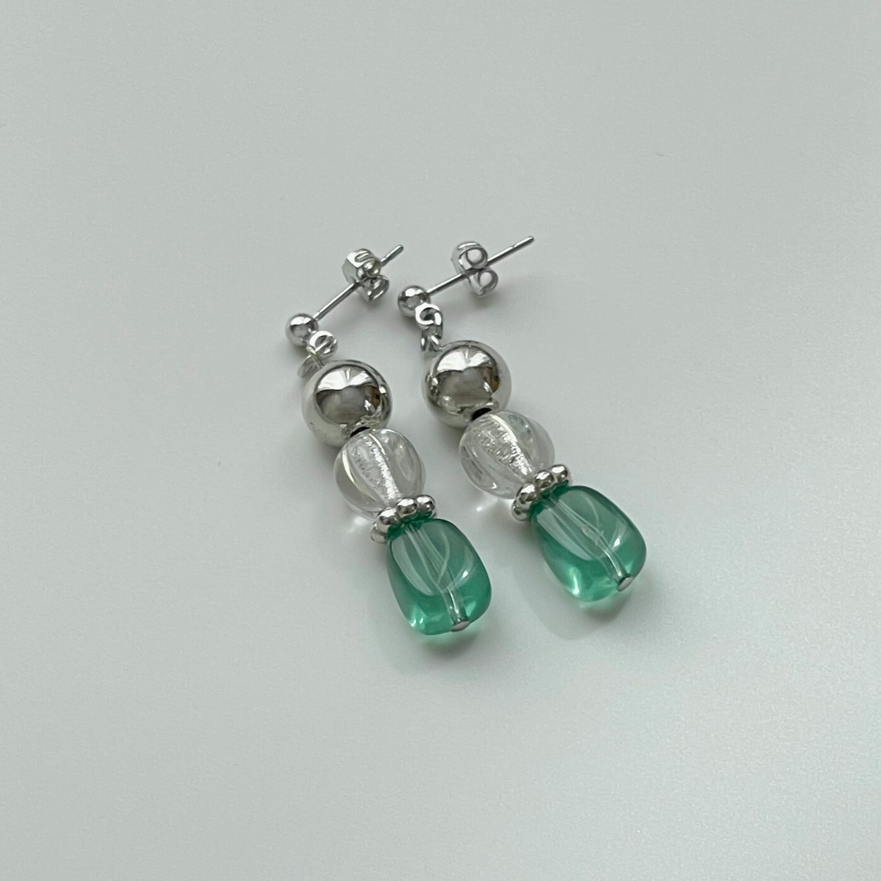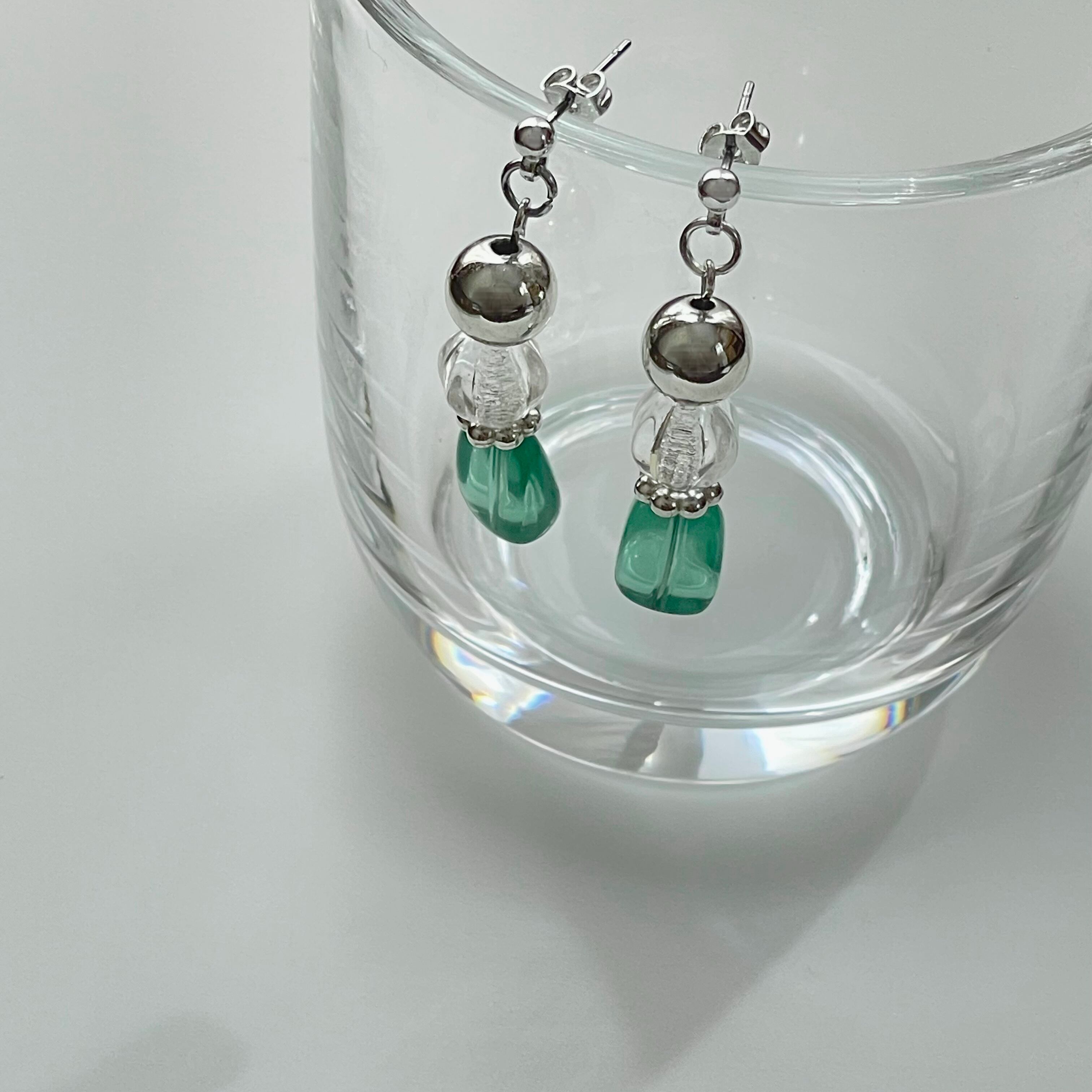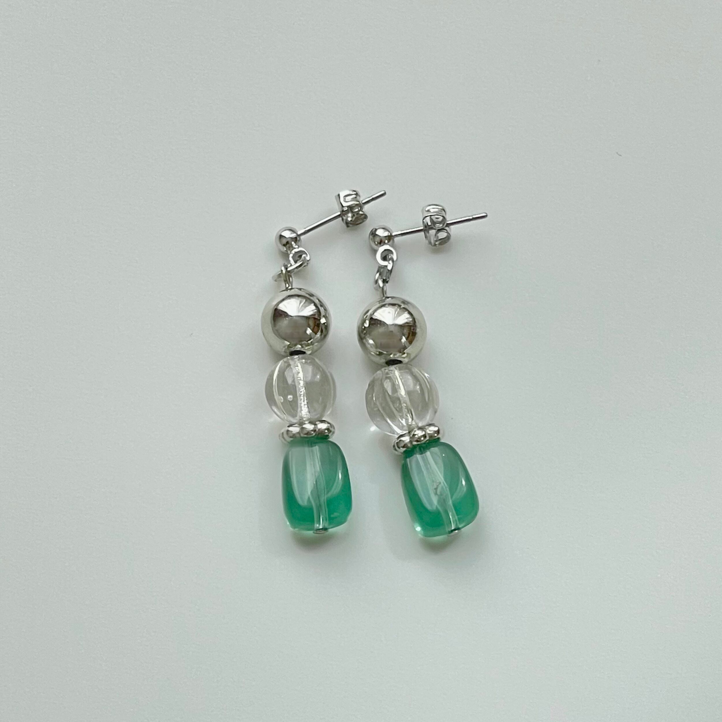 チェコガラスやグリーン・メタルのビーズを合わせた揺れるタイプのピアスです。